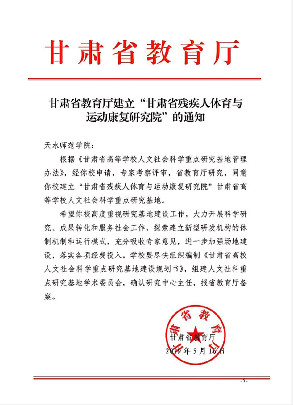 经学校申请、专家实地考察与项目评审,近日,甘肃省教育厅正式下发文件,同意在天水师范学院建立“甘肃省残疾人体育与运动康复研究院”甘肃省高等学校人文社会科学重点研究基地。这是继学校成立陇东南民间文艺研究中心、陇右文化研究中心、甘肃省高校乡村教师发展研究中心、甘肃华夏文明与文化产业研究中心智库以来,学校在甘肃省高等学校人文社会科学重点研究基地建设方面取得的又一重大突破。