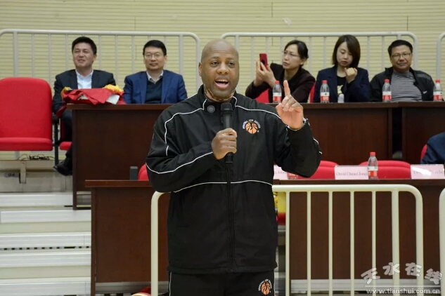 随后,在啦啦操的表演中拉开了今天篮球教学比赛观摩及演练交流活动的序幕,在蒂姆·奥布雷希特、大卫·琼斯的现场观看、指导下,天水师范学院女子篮球队、男子篮球队进行了表演比赛,比赛异常激烈。紧接着迎来了比赛的高潮部分,美国嘉宾蒂姆·奥布雷希特、大卫·琼斯分别加入到学生的两支男子球队中,与我校男子篮球队队员同框为现场的观众带来了一次精彩的NBA视觉盛宴,尤其是球员蒂姆·奥布雷希特的扣篮动作赢来了一次又一次的欢呼声。精彩的比赛过后,邀请三位美方嘉宾给球员们教练进行技术辅导,现场指导篮球队员投篮动作,临场教学,再一次拉近了与球员们的距离,增进了友谊,队员们认真聆听嘉宾们的指导,脸上洋溢着溢于言表的愉悦。三位美方嘉宾为篮球队员进行防守及进攻动作指导,最后优秀队员与球星二对二实战交流演练。