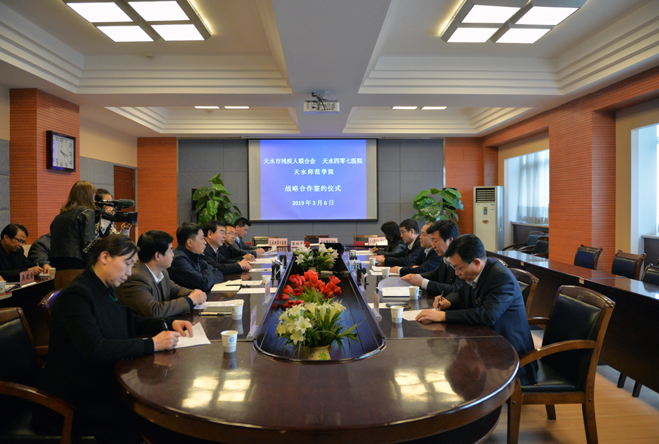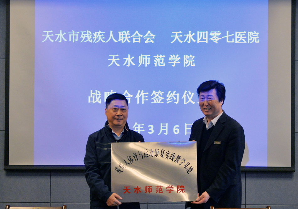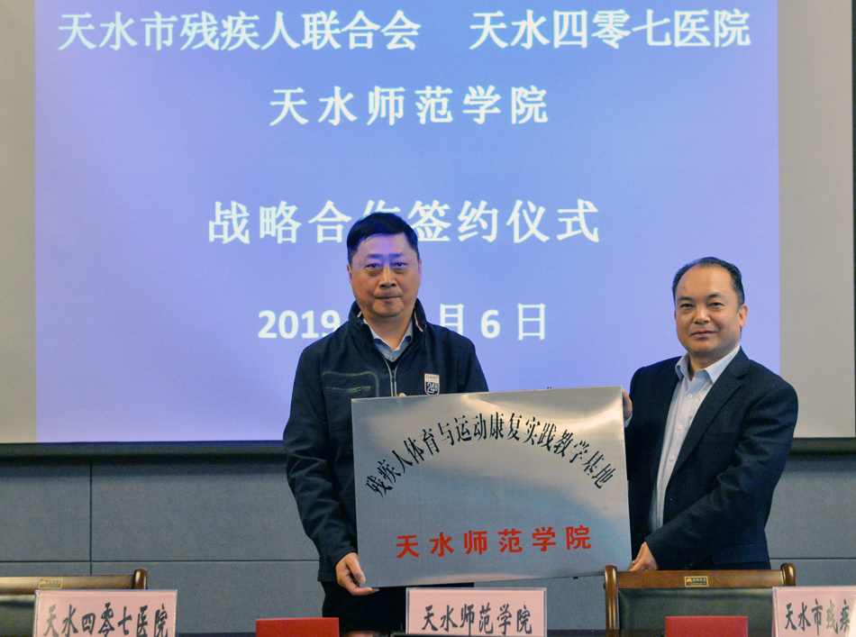 校长安涛和副理事长刘国平、董事长杨友良代表校地、校企三方签署了战略合作框架协议,并为天水市残疾人联合会、天水四零七医院颁授了“天水师范学院实践教学基地”牌。
